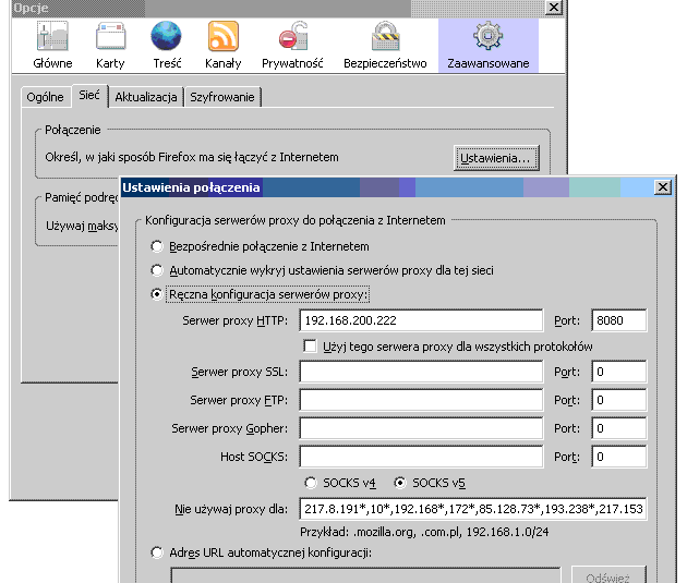Konfiguracja połączenia poprzez Proxy w Firefox:
